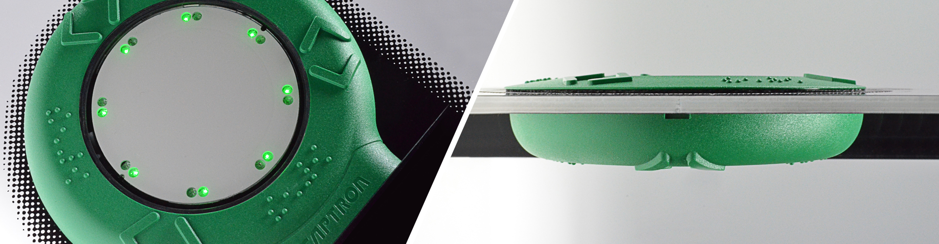 The extremely large touch surface with Ø 63 mm is optimally illuminated by 16 very bright LEDs. For visually impaired persons the colored sensor switch ring can be equipped with Braille and raised pictograms (according to TSI PRM).